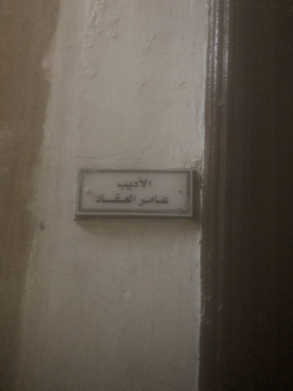 دفعت الباب الخارجي المهترئ وفوجئت بالظلام والغبار لأصعد السلالم القديمة التي صعدها العقاد إلى شقته بالدور الأول ووقفت وجها لوجه أمام الشقة الفارغة وبابها موصد لا يوحي أبدا بأنه بيت العقاد فلا لوحة تدل عليه وكأنهم يتعمدون إخفاءه عن الزوار، وفي مقابل شقة العقاد شقة ابن أخيه عامر العقاد وبابها موصد كذلك ولا أحد يسكنها ولكن ثبتت لوحة على الجدار كتب عليها “ الأديب عامر العقاد“،وقفت طويلا بين الشقتين تنفست التاريخ الثقافي في القرن العشرين ونظرت من خصاص الباب إلى الكراسي والأرائك حيث صالون العقاد وانثال على خاطري تيار من الأسماء :من الشعراء والكتاب والفنانين رواد الندوة: الصديق طاهر الجبلاوي، حواريّ العقاد أنيس منصور، الشاعر عبد الرحمن صدقي، الفنان صلاح طاهر، الفيلسوف زكي نجيب محمود، محمد خليفة التونسي، نعمات أحمد فؤاد، صوفي عبد الله، الفنانة مديحة يسري، الخادم عم أحمد الذي كان يوزع فناجين القهوة وكؤوس الليمون على رواد الصالون.