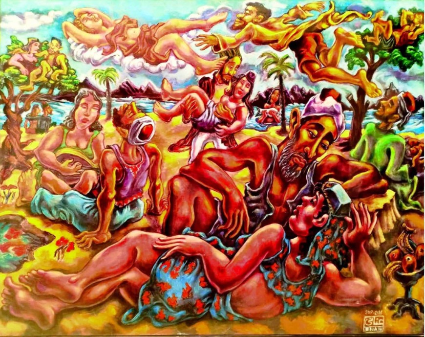 تتوهج اللوحة كـ “مولد شعبي أو حلم جماعي”، تكوين مزدحم لكنه محكم بسرد خفي، حيث كل شخصية تحمل حكاية صامتة. الشخصيات لا تقف ثابتة بل تطير، تسقط، تحاول النهوض، كأنها تبحث عن خلاص مؤقت من واقعها.