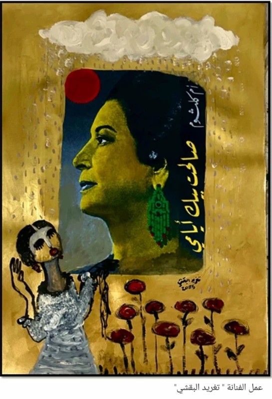 وارتكلت الفنانة “لطيفة الشيخ” لاعادة صياغة المشهد السينمائي كعالم حالم ميثولوجي خالد نابض يقود كرنفال بصري(لحبيب الروح) تلك الأيقونة الخالدة التي تتلألأ فيها “صباح وشادية وأنور وجدي” في سماوات مرصعة بالنور والنجوم،وموكب تتداخل الأحجار الكريمة مع الورود.وكان عمل الفنانة “مريم السندي” كتوثيق بصري وأيقونة غنائية مستوحاة من أغنية”دقّّوا الشماسي”،وإحياء لحالة وجدانية كاملة تجمع بجمهوره، وتعزيز قيمة الفن بوصفه ذاكرة جماعية، عبر استحضار روح الحقبة الذهبية للفن المصري، وتوظيف الأبيض والأسود كمعادل لأجواء السينما القديمة والطابع الكلاسيكي والبهجة والحرية والانطلاق والموسيقي،وربط الحاضر بالماضي.