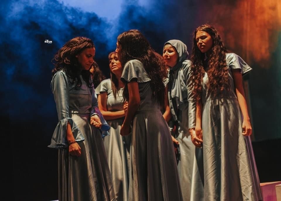تبدأ المسرحية باستعراض راقص على أغنية “كنت بخاف” للمطربة دينا الوديدي، ويكون الاستعراض بتقنية خيال الظل مع راقصة حقيقية تتفاعل مع خيال الظل على الخلفية، ويعكس الاستعراض تناقضًا إذ تبدو الراقصة مبتهجة وسعيدة بينما خيال الظل تبدو على العكس وبعد انتهاء الاستعراض تظهر ثلاث فتيات يرتدين فساتين بألوان مبهجة أحمر وأصفر وأرزق، ومن البداية بالتأمل في كلمات الأغنية من تأليف ندى الشبراوي تتكشف بعض قضايا الحكاية المسرحية، فتقول: