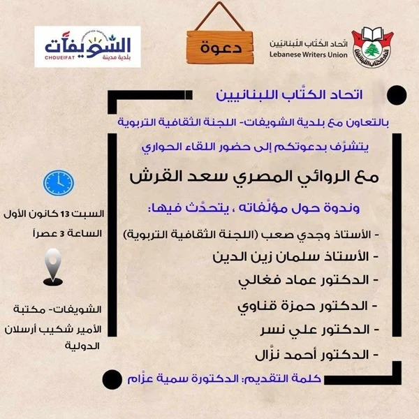 * ألقيت في ندوة نظمها اتحاد الكتاب اللبنانيين حول مؤلفات سعد القرش، بمكتبة الأمير شكيب أرسلان في بيروت، في 13 ديسمبر/كانون الأوّل 2025