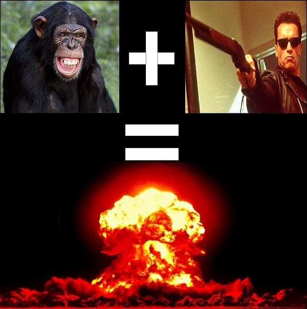 ما حدث أن الشيمبانزى تمكّن من فتح باب قفصه، والخروج منه، والاستيلاء على بندقية من البيت، و – من واقع مشاهداته لأفلام شوارزنيجر – تعلّم كيف يحشو البندقية بالرصاص، وبعد قليل، بدأ فى الاستمتاع بإطلاق النيران تجاه الرجل!