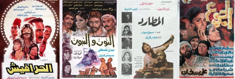 كانت رواية الحرافيش هى الأوطد علاقة بعالم السينما, فالرواية التى نشرها نجيب محفوظ عام 1977, جذبت المخرجين والمنتجين لاقتطاف القصة تلو الأخرى من بين دفتيها ليصنعوا منهم ستة أفلام, ظهروا جميعا فى عامى 1985 و 1986 باستثناء فيلم أصدقاء الشيطان الذى تأخر لعام 1988. لم يكن للأفلام الستة طاقم مشترك, ولم تنتج على هيئة سلسلة متعاقبة, وحتى لم يكن بينها عناصرا مكررة, فذبلت القصص ببعدها عن أرضها الأصلية وخرجت الأفلام فى هيئة مترهلة. لم يشارك أى من الممثلين فى أكثر من فيلمين, وكان من بين أصحاب الظهور مرتين نور الشريف وفريد شوقى وصلاح قابيل ومحمود الجندى, كما تواجد حسين الإمام فى دورين ثانويين أيضا. أما بالنسبة للتأليف فكان للسيناريست أحمد صالح النصيب الأكبر بفيلمين هما الحرافيش والمُطارد, وكذلك شارك مصطفى محرم فى كتابة شهد الملكة والجوع, وللأسف كان لحسام الدين مصطفى النصيب فى إخراج فيلمين, هما شهد الملكة والحرافيش.