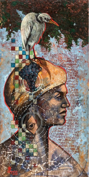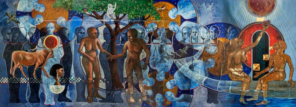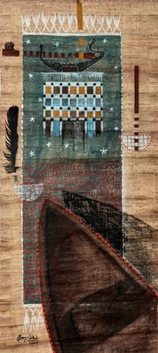 هذه النافذة الرمزية التي يعبر الضوء من خلالها تتحول إلى بوابة في لوحة المعرض الرئيسية “ماعت” والتي تعتبر إعادة تمثيل لبردية قديمة.. والتي يجد المتلقي نفسه يفتح اللوحة ليرى بقية الرسم-تصل مساحتها إلى خمسة أمتار- كأنه يكشف المخفي ويساهم ولو رمزيا في عملية المعرفة حيث أن مجرد حركة بسيطة تجعلك متورطا في رحلة الكشف.