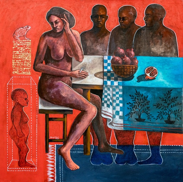 أما لوحة “الخروج للنهار” التي يحمل المعرض اسمها.. نجد الرجل يقف بثبات على حافة المركب أما المرأة والتي يتخذ شكل جسدها في أكثر من لوحة شكل المركب نفسه بانسيابيته الأنثوية التي تحمل معنى النجاة حيث يظل المركب رمزا للتنقل الآمن في رحلتنا بين البحر واليابسة..