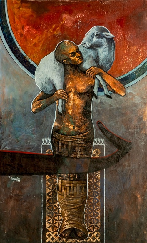 يبدو الرجل هنا محملا بمعان متناقضة فنصف الجسد الأسفل مقيد بشرائط عريضة مثل مومياء لم تعد بحاجة إلى الساقين.. بينما يحمل على كتفيه حملا حيا والذي يعد رمزا للفداء.. يلتفتان إلى بعضهما الحمل والرجل وكأنهما يملكان لغة حوار خاصة وينتظران في رجاء.