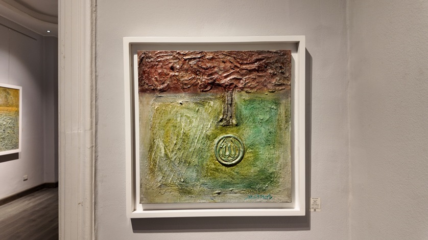 إحدى لوحات حكيم وقد توسطها لفظ الجلالة (الله) بحروف عربية في مزج بين الجميل والجليل